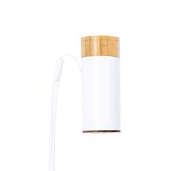 La base di ricarica è elegante e funzionale. Presenta un coperchio in bambù e una batteria da 4.500 mAh. Ogni cuffia ha una batteria da 30 mAh e include controlli integrati e funzione vivavoce.
