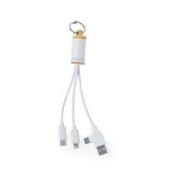 Cavo di ricarica realizzato con una combinazione di bambù e materiali riciclati. Include una doppia connessione USB/Type C e connessioni Micro USB, Type C e Lightning. Dotato di un pratico anello di trasporto e presentato in una confezione kraft individuale con carta protettiva.