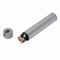 20 pastelli colorati in scatola di metallo. Include un temperino nel coperchio.