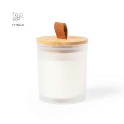 Candela aromatica in vaso di vetro con coperchio in bambù.